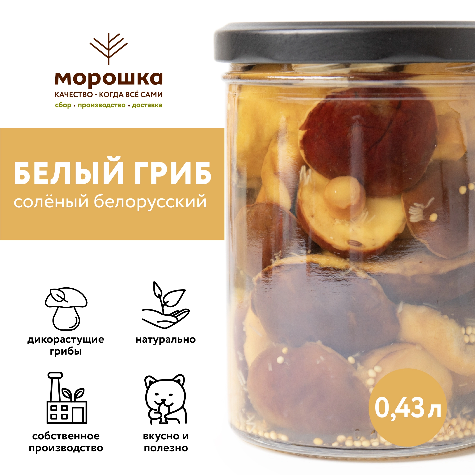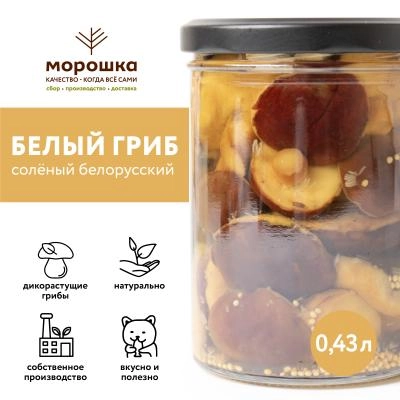 гриб белый, вода, соль, лимонная кислота, семена горчицы, душистый перец, лавровый лист. Сорт первый: объём 0,43 литра, сухой вес продукта не менее 280 г, вес с рассолом – 430 г