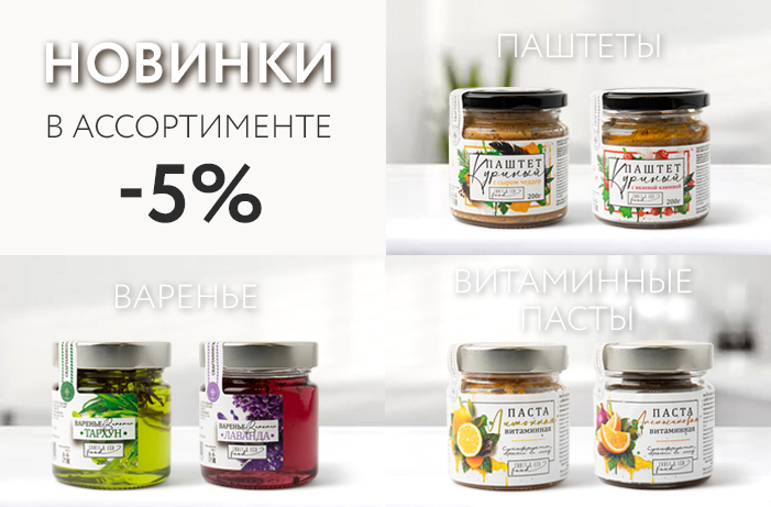Мы рады представить вашему вниманию парад новинок для истинных гурманов: девять оригинальных вкусов варенья из трав, четыре изысканных вкуса карамели, три вида паштета из куриной печени, а также витаминную пасту, для заряда бодростью и энергией на целый день.