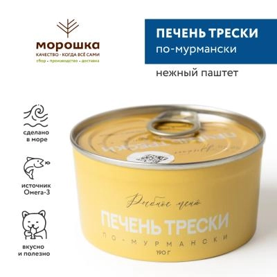 Печень трески "по-мурмански" - это высококачественная свежайшая печень трески, имеющая консистенцию нежного паштета, то есть в отличие от обычной печени она не кусковая.