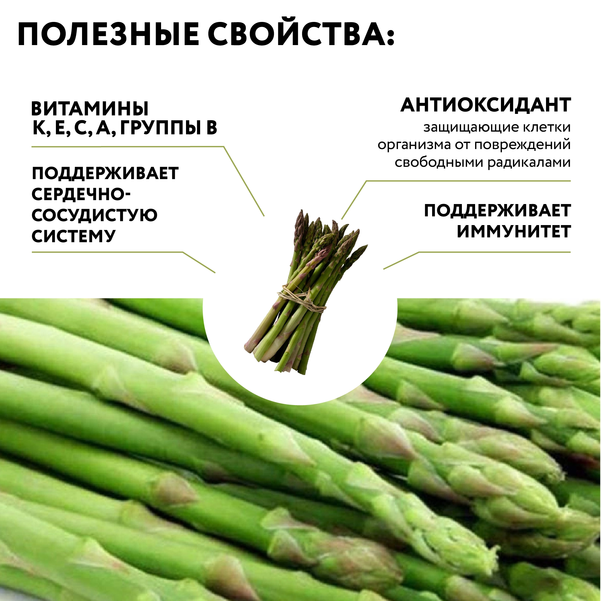 Спаржа — очень полезный низкокалорийный продукт, в котором содержится большое количество витаминов и микроэлементов. Основные полезные свойства: